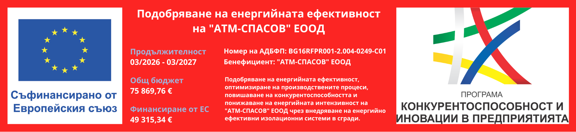 Чрез настоящата схема фирма “АТМ-Спасов “ЕООД ще допълни и надгради мерките реализирани с договор по Оперативна програма “Развитие на човешките ресурси” 2007-2013 г.схема за безвъзмездна финансова помощ BG 051 PO 001-2.3.02 “Безопасен труд”.